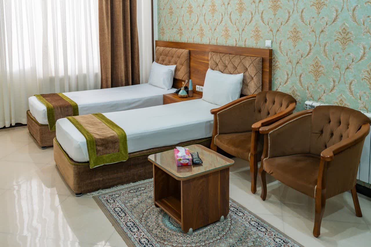 - اتاق سه تخته: این اتاقها برای خانوادههای کوچک یا گروههای سه نفره مناسب هستند. آنها دارای سه تخت تک نفره یا یک تخت دو نفره و یک تخت تک نفره، حمام اختصاصی، تلویزیون و یخچال هستند.